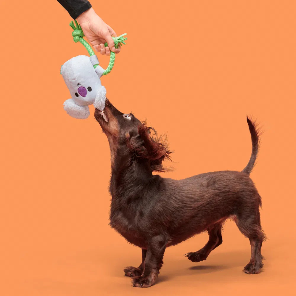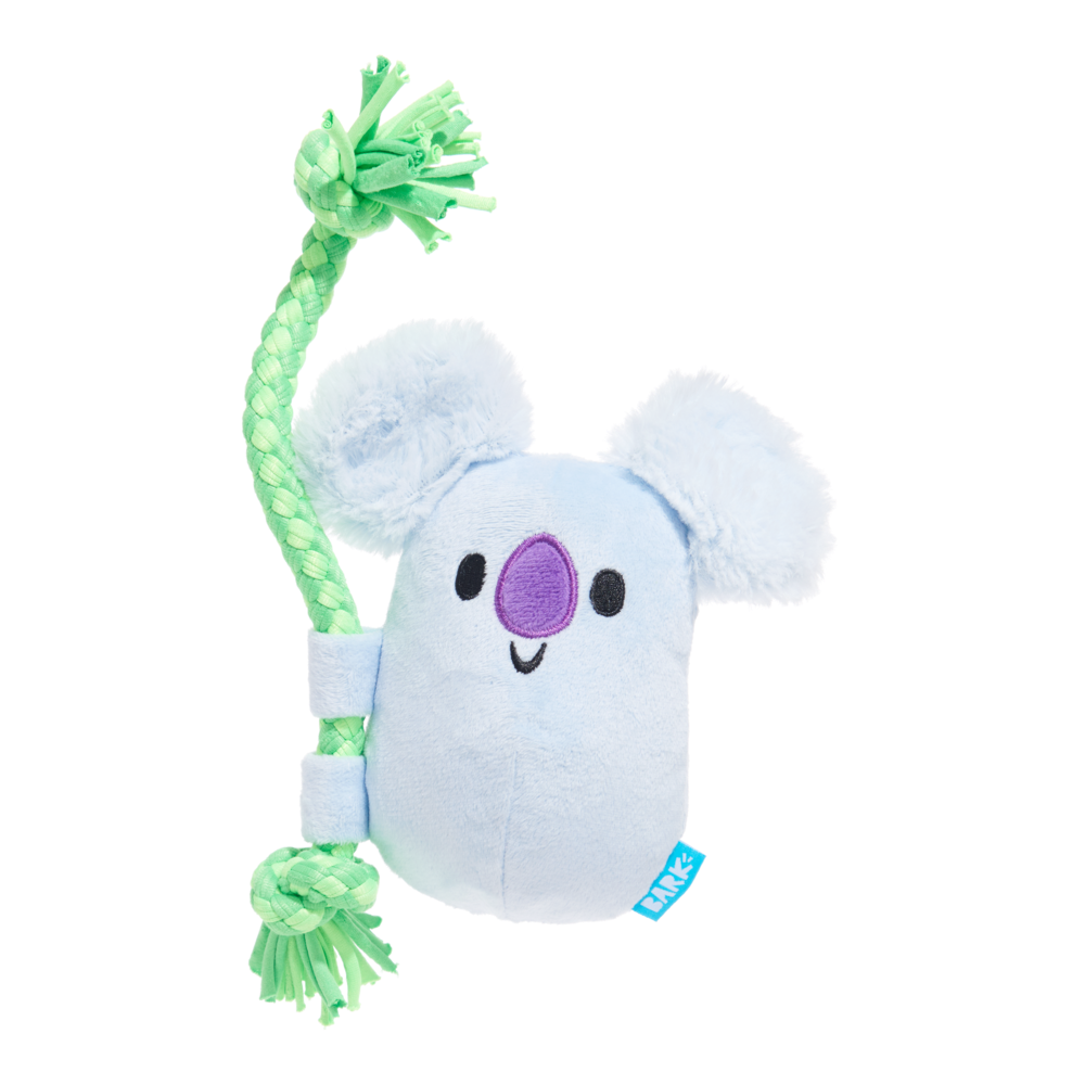 Take playtime to new heights with this koa-uddly koala dog toy! This cuddly climber is ready to rope your pup into some intense koa-limbing action—just grab onto his t-shirt rope and hang on tight! Once you’re up in the treetops, the fun continues with his squeaker, crazy crinkle, and long, shreddable fuzz. Whether it’s a tug, a toss, or a good chew session, this koala is ready for an epic forest adventcha, mate! FEATURES: BARK Koa Koala green blue Australian koala plush dog toy ALL SIZES Pull-through T-shirt rope for tugs of fun. Made with a squeaker for extra excitement. Long & Strong hair for dogs who love to shred. Pull-through T-shirt rope for tugs of fun.