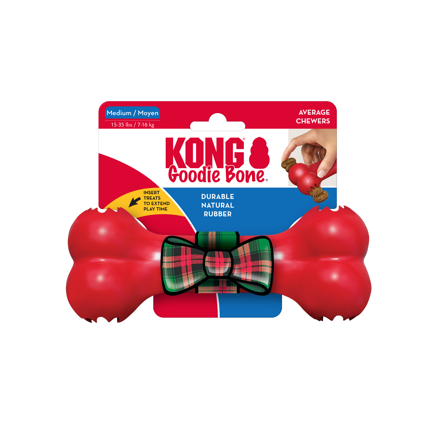The KONG Goodie Bone™ toy engages dogs that delight in chew sessions. Made from the KONG Classic unique natural red rubber formula, this bone features the patented Goodie Grippers ™ that turn this entertaining toy into a fun treat dispensing challenge that can be stuffed with your dog’s favorite kibble. Want to extend the chew session? Stuff with KONG Snacks™ and entice with a bit of KONG Easy Treat™.