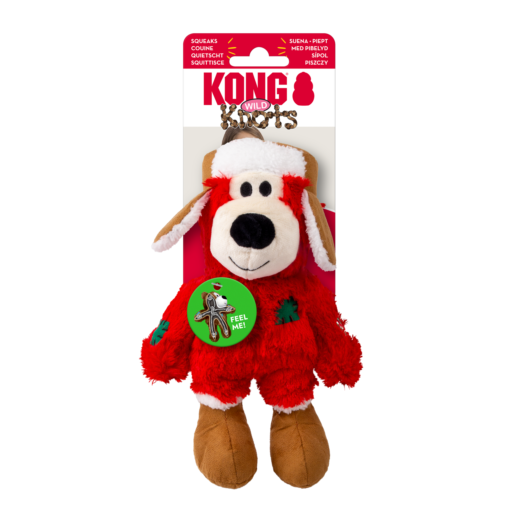 KONG® Holiday Wild Knots Bear is soft and snuggly on the outside and tough on the inside thanks to an internal knotted rope skeleton that helps him last way longer than the holidays. Seasonal colors and accessories are perfect for wintertime snuggles and indoor play. Chewing and tugging on this durable, adorable friend satisfies natural instincts while the squeaker prolongs play. Less stuffing makes for less mess if things get too wild!
