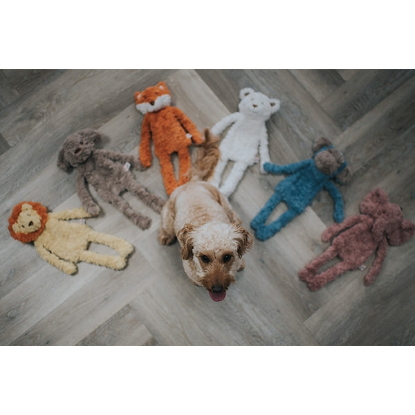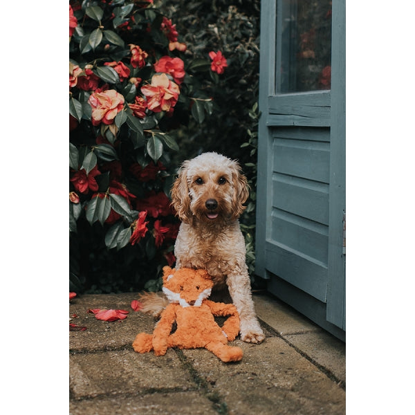 My Dog luxury plush toy - stuff tummy with something that carries scent to comfort dog while away or at work. Crinkle paper, 4.5cm Squeaker, Flat tummy with Velcro to close. Match the toy to your dogs personality & character. Fox characteristics - clever, distinguised, quick, curious, crafty.