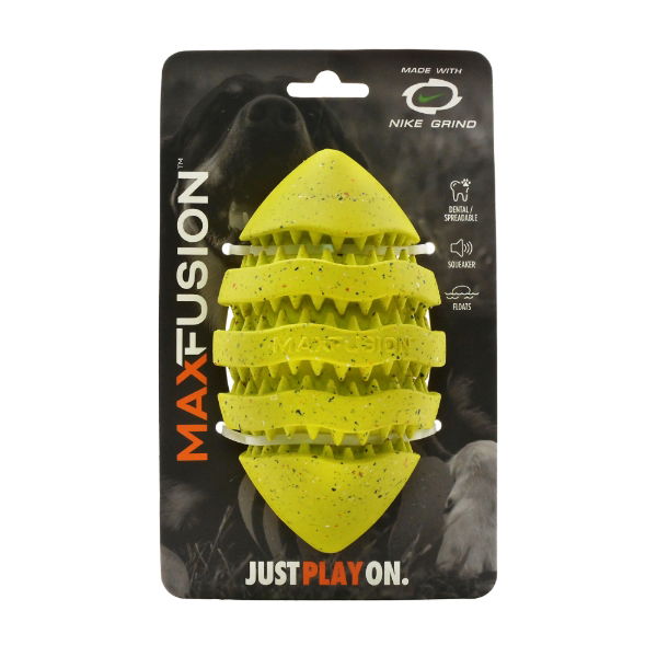 The Nike Max Spiro Football™ Dog Toy combines performance and purpose by blending up to 80% natural rubber with at least 20% Nike Grind rubber—made from recycled athletic shoe soles. The result? A durable, engaging toy that your customers and their pets will love.
