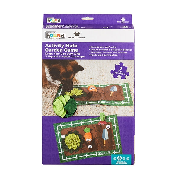 Nina Ottosson Activity Matz Garden Game Mat. KEEPS DOGS BUSY: The Garden Game Activity Mat keeps your dog busy with three physical and mental challenges. REDUCES DESTRUCTIVE BEHAVIOR: Fights boredom by exercising your dog's mind, keeping them from exhibiting behaviors like chewing, digging, and excessive barking. 3 WAYS TO PLAY: Increase the challenge by incorporating more hidden treat pouches and closures. NON-SLIP & WATER-RESISTANT BASE: Easy to clean and wipe off.