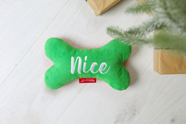 Naughty and Nice Toy for Dogs This classic bone-shaped plush dog toy has a fun and festive twist, making it the perfect stocking stuffer for your four-legged friend this Christmas. In a Christmassy colour scheme of red and green, the reversible dog toy has a naughty and a nice side, depending on your pets behaviour! A great toy for solo fun or playing together, the plush bone also makes a cuddly companion when snuggling down for a nap.