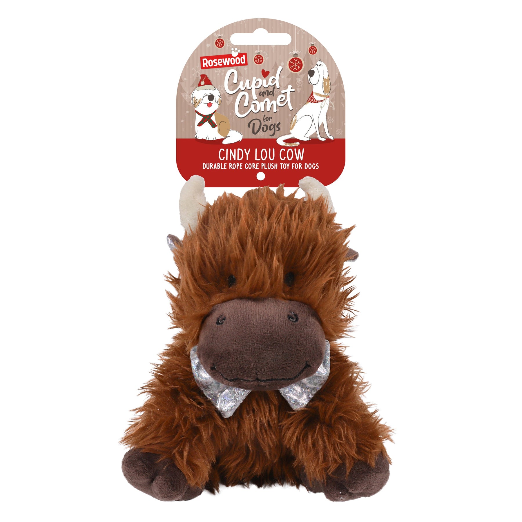 The Rosewood Cindy Lou Cow Christmas Dog Toy adds a festive twist to your pet's playtime with its charming Highland cow design. This plush toy features a soft exterior for cuddling and light play, while its durable rope core ensures extra strength for moderate chewing. Perfect for gentle interactive games, it brings both holiday cheer and fun to your dog's toy collection. Not suitable for heavy chewing or tug-of-war games.