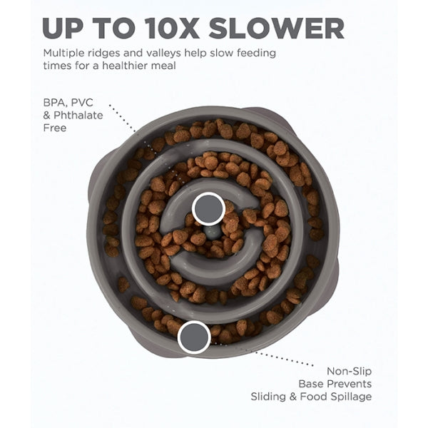 Outward Hound uniquely designed Fun Feeder dog bowls feature meal-lengthening ridges to help slow down your dog?s eating time by 10X! Common issues that arise in fast-eating dogs include bloating, regurgitation, and canine obesity. Our Fun Feeder Slo Bowls both challenge and engage your dog during mealtime while helping reduce overeating behavior. Outward Hound's Fun Feeder Slo Bowl, slow feeder dog bowls are made to hold in both fun and food as your dog forages through the fun patterns with its non-slip base. Bowls are BPA, PVC, and phthalate free.Fun Feeders are available in multiple sizes and ridge patterns. These bowls are great for dry, wet, or raw food diets. The Large/Regular holds up to 4 cups of dry kibble, the Medium/Mini holds 2 cups, and the Small/Tiny holds 3/4 cup. Fun Feeder dog bowls are top rack dishwasher safe. Less work for you means more pup playtime after!