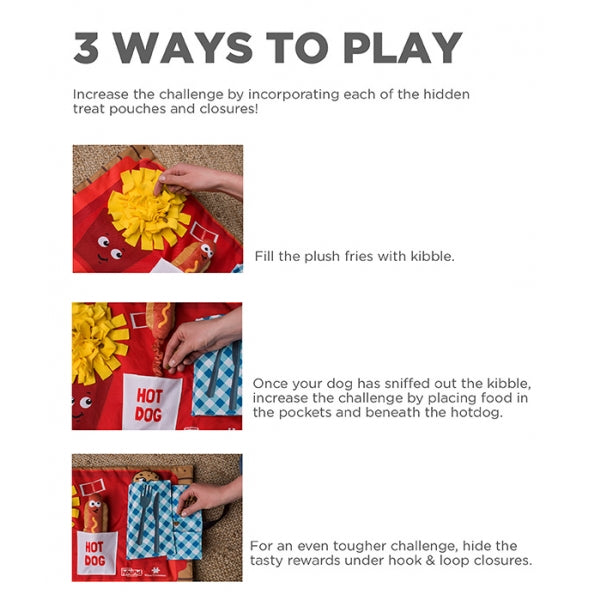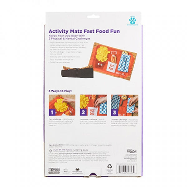 Nina Ottosson Activity Matz Fast Food Fun Mat. KEEPS DOGS BUSY: The Fast Food Fun Activity Mat keeps your dog busy with three physical and mental challenges. REDUCES DESTRUCTIVE BEHAVIOR: Fights boredom by exercising your dog's mind, keeping them from exhibiting behaviors like chewing, digging, and excessive barking. 3 WAYS TO PLAY: Increase the challenge by incorporating more hidden treat pouches and closures. NON-SLIP & WATER-RESISTANT BASE: Easy to clean and wipe off.