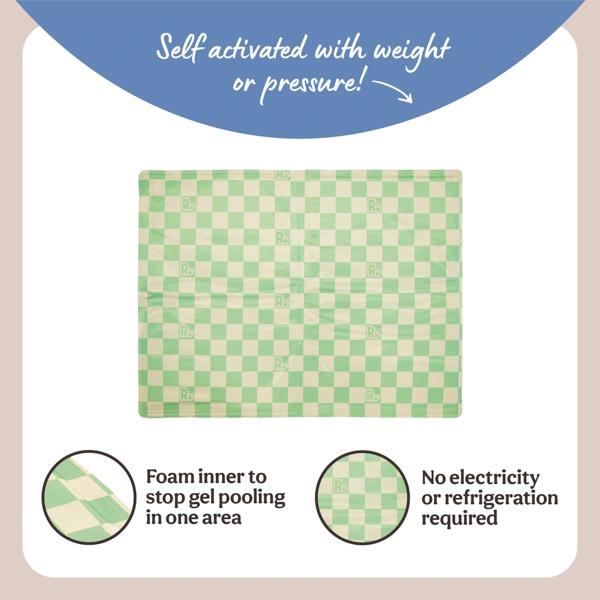 Keep your dog cool and comfortable during hot weather with the Green & White Checkered Dog Cool Mat. Featuring advanced weight-activated gel, this mat instantly cools down without the need for refrigeration or freezing. The unique gel technology ensures your dog stays cool for hours, while the foam inner layer prevents the gel from shifting, offering even and consistent cooling across the mat.