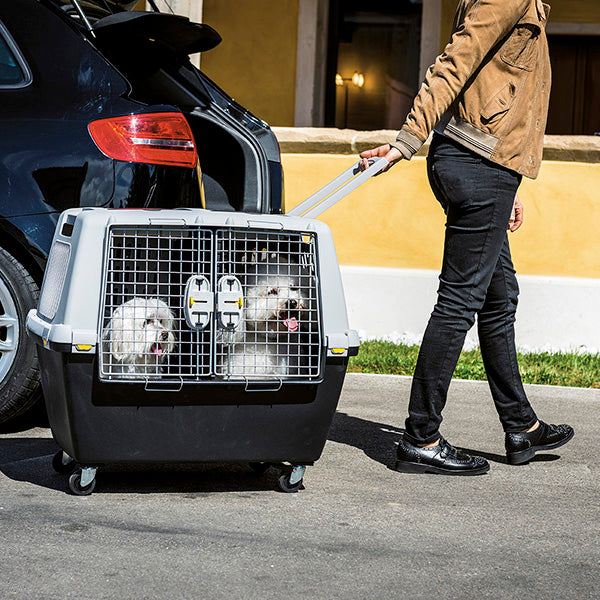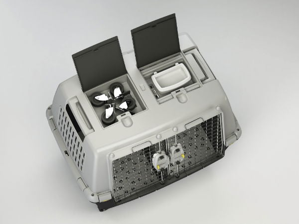 Gulliver touring is a practical and roomy carrier that allow to comfortably and safely travel with your pets. Provided with: anti-slip and hygienic drainage mat, seat belts secure system for car transport, front doors with double lock, water-basin and compartments for accessories.