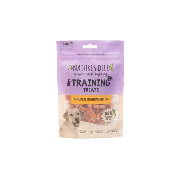 Natures Deli Chicken Training Bites 100g. A Big Hello from Petello! We make natural treats for happy dogs. They're healthily balanced, naturally nutritious and delicious, which is why we called them Natures Deli.Recommended For Dogs over 2 months.Key Benefits - Naturally nutritious and delicious. No artificial colours or flavours. Slowly oven roasted in own juices for flavour. Made from choice cuts packed with vital proteins. Small cubes of chewy 82% chicken breast, slowly oven roasted in their own juices, naturally nutritious and delicious. A high protein, great tasting treat for your pet.