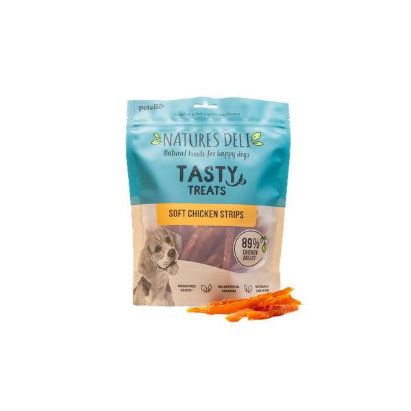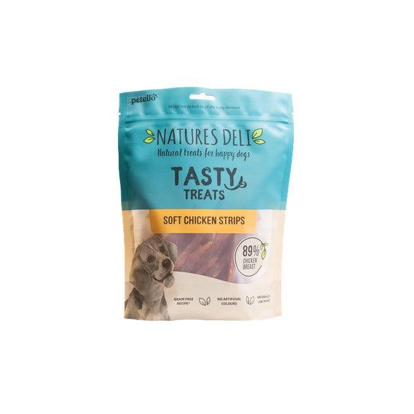 Natures Deli Soft Chicken Strips 500g. A Big Hello from Petello! We make natural treats for happy dogs. They're healthily balanced, naturally nutritious and delicious, which is why we called them Natures Deli.Recommended For Dogs over 2 months.Key Benefits - Naturally nutritious and delicious. No artificial colours or flavours.