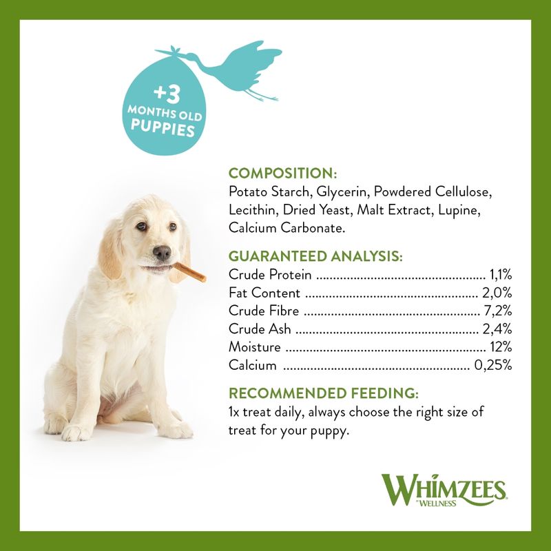 WHIMZEES puppy treats are designed to help clean teeth and reduce plaque and tartar through your pup’s chewing action. A natural, healthy introduction to daily dental care, our puppy treats are softer than our adult WHIMZEES Stix. COMPOSITION: Potato Starch, Glycerin, Powdered Cellulose, Lecithin, Dried Yeast, Malt Extract, Lupine, Calcium Carbonate. FEEDING GUIDE: 1pc/day. Recommended for dogs 3 months and older. Always have fresh water available to your dog and supervise your dog while it is chewing