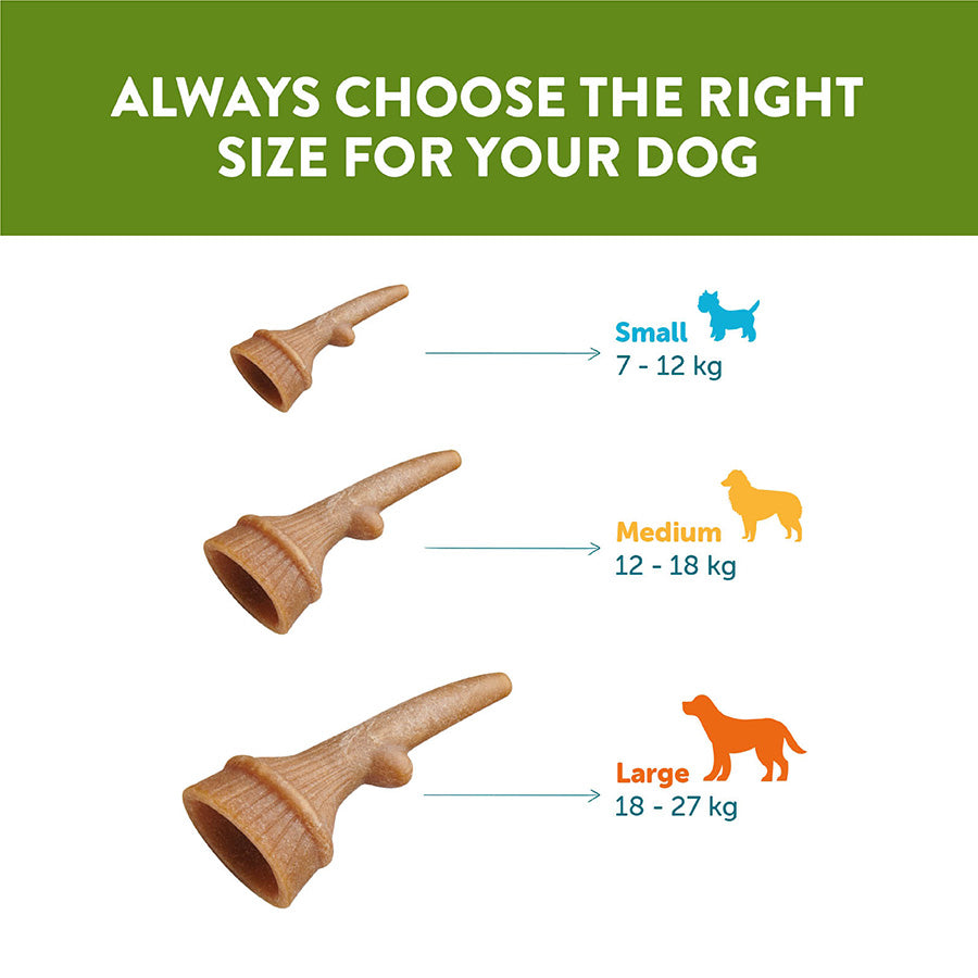 The Whimzees antlers are suitable for dogs aged over 9 months and are available in the following sizes: