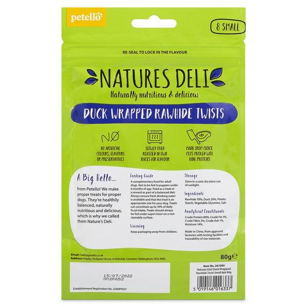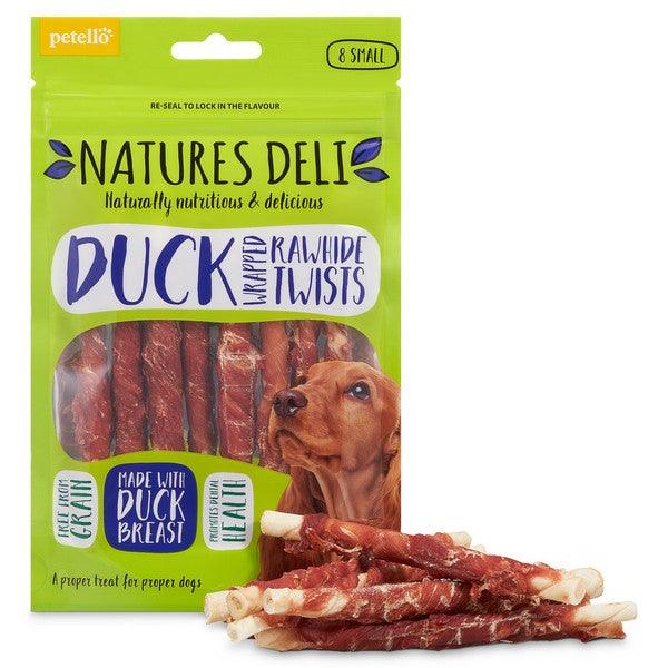 Natures Deli Duck Wrapped Rawhide Twist Sml 8pk 80g. A Big Hello from Petello! We make natural treats for happy dogs. They're healthily balanced, naturally nutritious and delicious, which is why we called them Natures Deli. Recommended For Dogs over 2 months.Key Benefits - Naturally nutritious and delicious. No artificial colours or flavours. Slowly oven roasted in own juices for flavour. Made from choice cuts packed with vital proteins. Premium duck breast, hand wrapped around a natural rawhide stick. Slowly roasted in the oven in its own juices, and delicious and nutritious treat for your pet, and great for cleaning teeth.