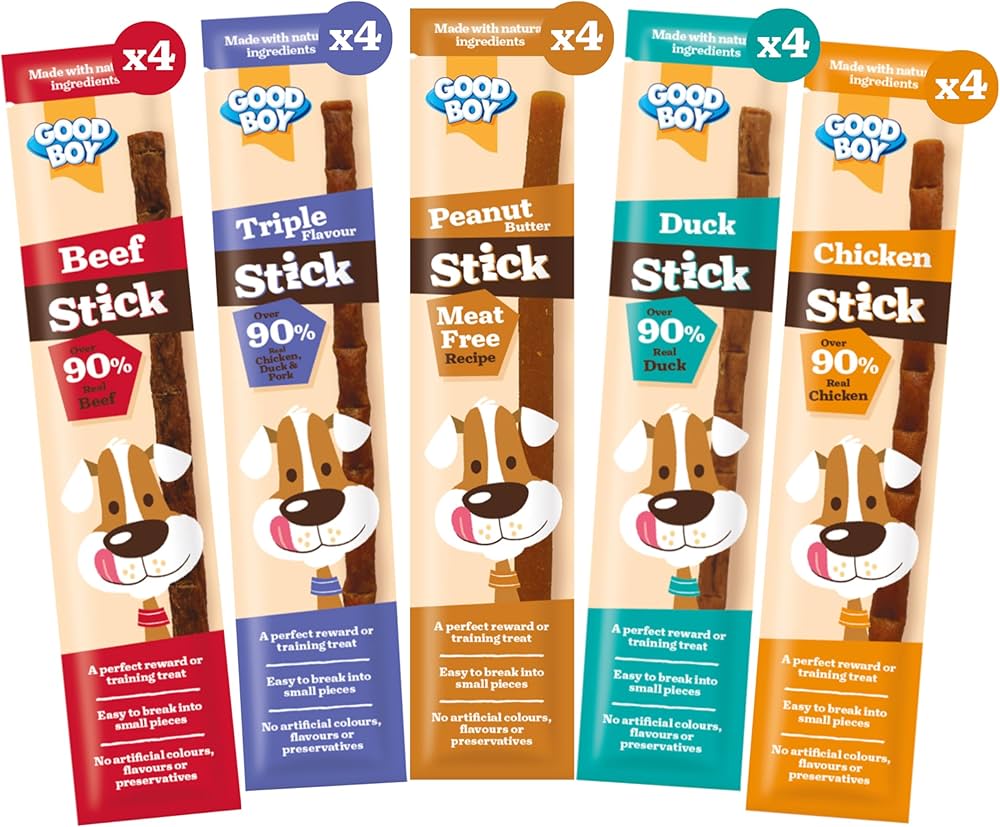 VARIETY PACK: Contains 20 Meaty Sticks, 4x Beef, 4x Chicken, 4x Duck, 4x Peanut Butter and 4x Triple Flavour