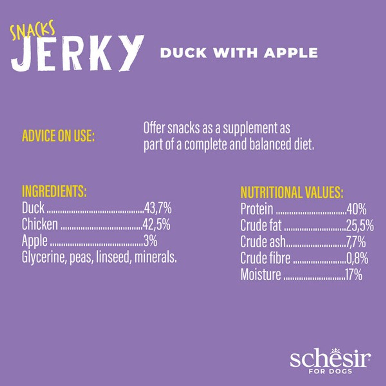 Schesir for Dogs Snacks - Jerky, Duck with Apple. Duck is the First Ingredient. Grain Free. Free of Artificial Colours & Flavours. Made in the USA.