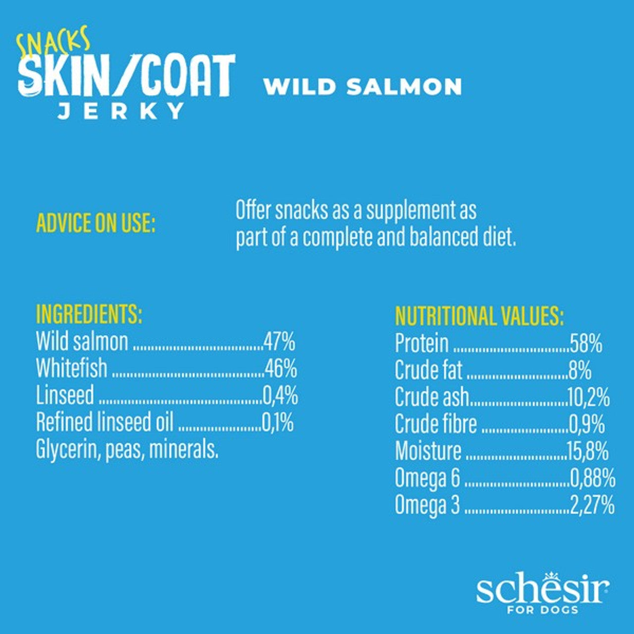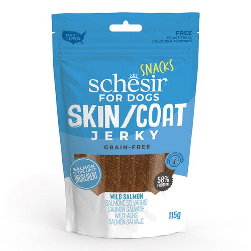 Schesir for Dogs Snacks - Jerky Skin & Coat, Wild Salmon. Salmon is the first ingredient. Grain Free. With Omega 3&6, Zinc, Biotin & Vitamin. Free of Artificial Colours & Flavours. Made in the USA.