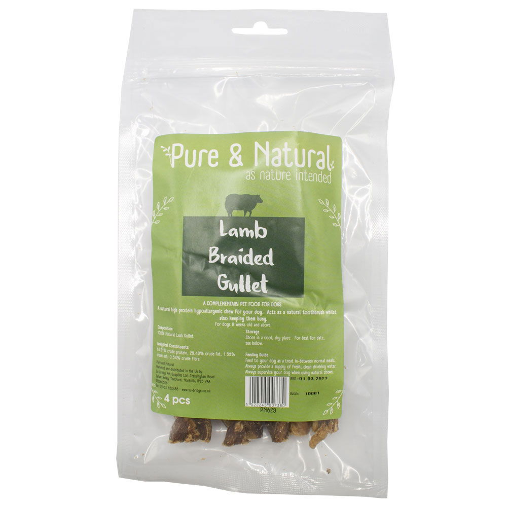 Pure & Natural Lamb Gullet Braided, the perfect snack for dogs who love a tasty and nutritious treat! Made from 100% pure lamb gullet, this braided treat provides a unique chewing experience for dogs. Lamb gullet is a muscular tube that connects the oesophagus to the stomach, and is a rich source of protein for dogs.