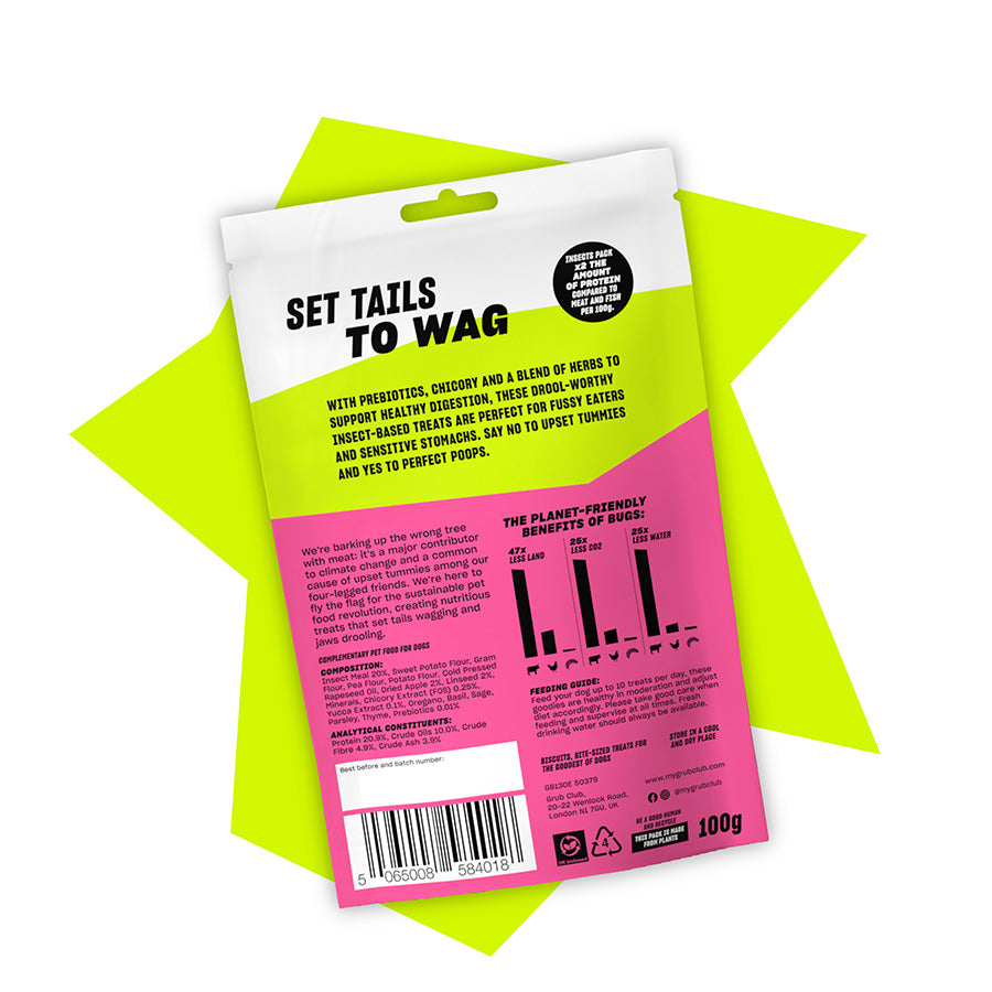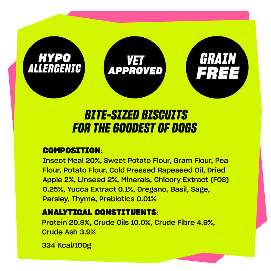 Hypoallergenic dog treats made with clean insect protein, prebiotics, parsley, and sage. Designed to support your dog's gut health and perfect for sensitive tummies. This novel protein is easily digestible and with the support of prebiotics these treats are great for dogs with sensitive tummies. Hand baked in carbon-neutral, wood-fired ovens here in the UK