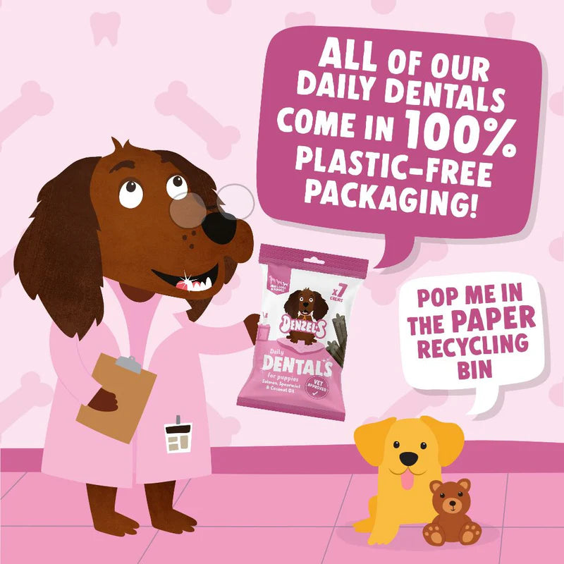 Find 7 x small dental chews inside every plastic-free pack. Each dental is approx. 8cm long, suitable for young pups and small dogs under 10kg.