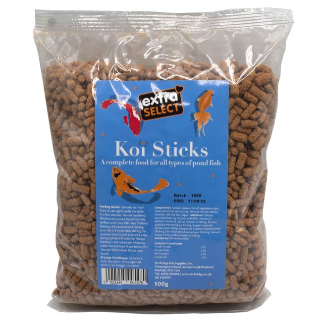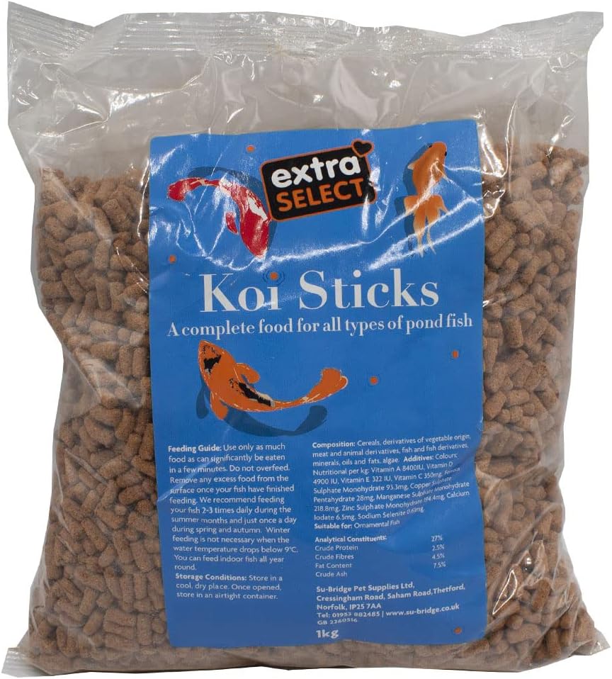 Koi Sticks from Extra Select. A complete food for all types of pond fish. Contains cereals, vegetable derivatives, meat & animal derivatives, fish & fish derivatives, oils & fats, minerals and algae.