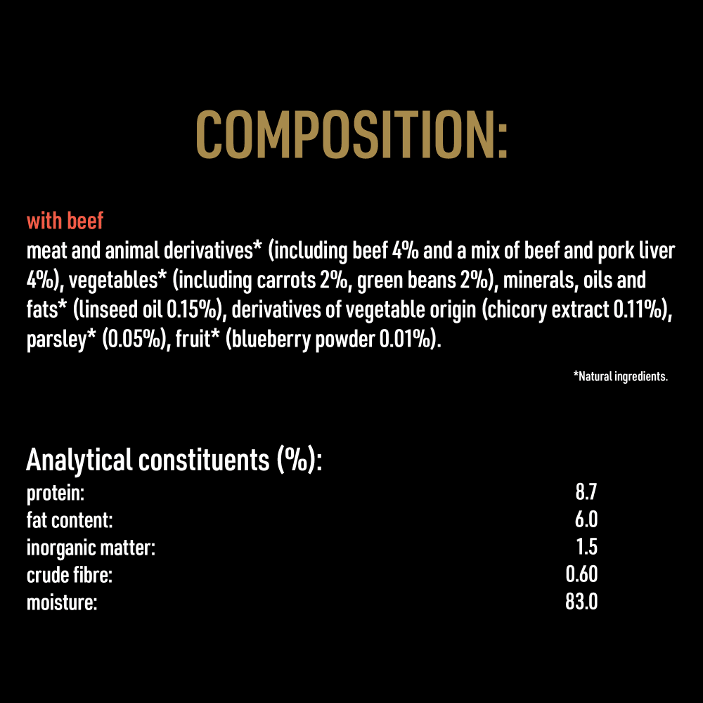 Cesar® NATURAL GOODNESS™ Adult Wet Dog Food with Beef in Terrine is a 100% complete wet dog food which contains superfoods and prebiotics. This adult wet dog food includes green beans, an excellent source of Vitamin K, carrots which are an excellent source of antioxidants and blueberries, an excellent source of manganese.