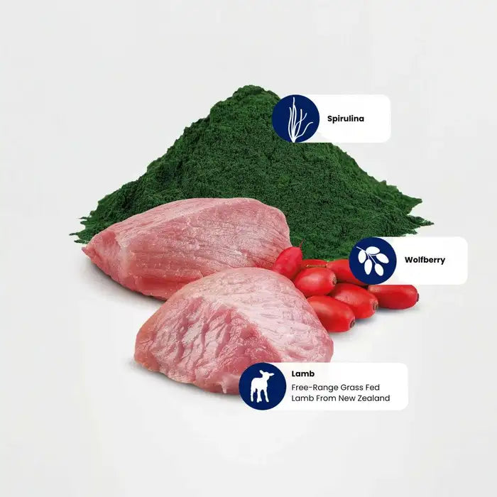 Lamb (24%), Dehydrated Lamb Protein (22%), Sweet Potato, Chicken Fat, Dehydrated Herring Protein, Dried Spirulina (5%), Herring, Dried Eggs, Dried Wolfberry (2.5%), Fish Oil (from Herring), Pea Fibre, Dried Carrot, Alfalfa Meal, Chicken Cartilage (source of Glucosamine and Chondroitin Sulphate), Inulin, Fructo-oligosaccharides, Yeast Extract (Source of Manno-oligosaccharides), Dried Spinach, Psyllium Husks and Seeds, Sodium Chloride, Dried Brewers’ Yeast, Turmeric, Aloe Vera Extract.