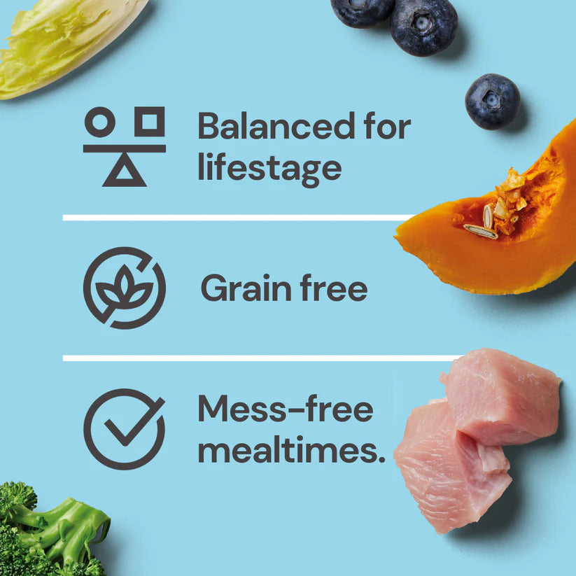 86% Fresh Meat and Offal / 14% Vegetables and Superfoods / 0% Grain or filler