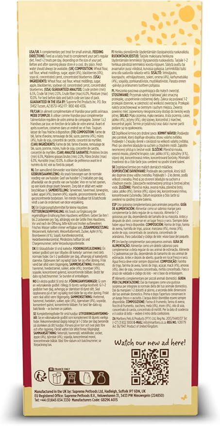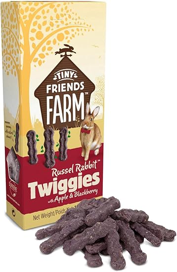 Russel Rabbit Twiggies with Apple & Blackberry are tasty baked treats fresh from our bakery, made with the wholesome goodness of natural grains and tasty fruits. Russel Rabbit Twiggies are perfect when you want to give your pet a tasty treat. They can be carefully hand-fed to your pets, helping you to build those special moments together. One or two can also be hidden around your pet’s enclosure to encourage natural foraging. And remember to give your rabbits lots of fresh hay daily and unlimited access to water. Russel Rabbit Twiggies are also suitable for guinea pigs, chinchillas, hamsters, gerbils, mice, and rats.