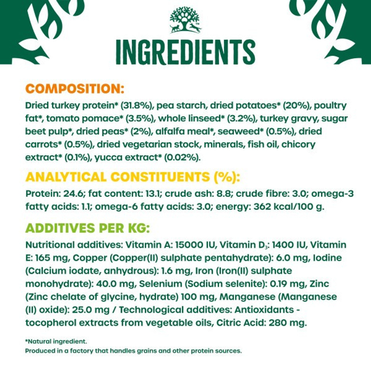dried turkey protein* (31.8%), pea starch, dried potatoes* (20%), poultry fat*, tomato pomace* (3.5%), whole linseed* (3.2%), turkey gravy, sugar beet pulp*, dried peas* (2%), alfalfa meal*, seaweed* (0.5%), dried carrots* (0.5%), dried vegetarian stock, minerals, fish oil, chicory extract* (0.1%), yucca extract* (0.02%). *Natural ingredient.