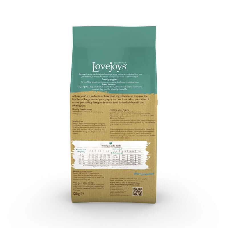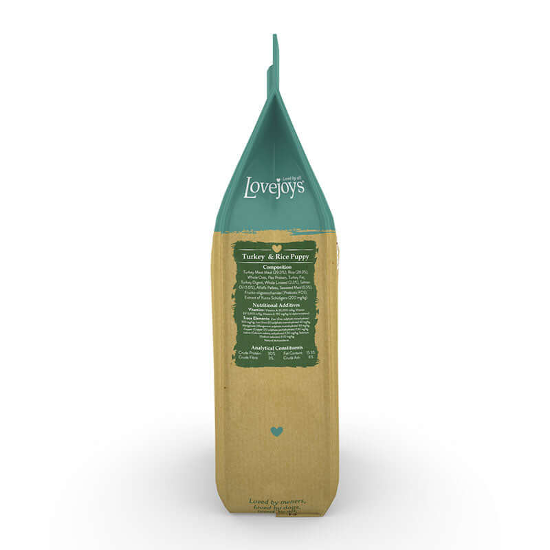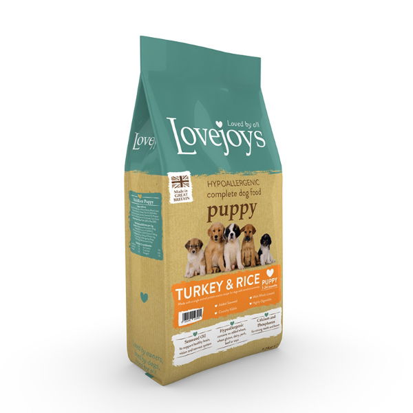 Lovejoys Puppy Dry with Turkey & Rice is a complete, hypoallergenic food designed for puppies.Growing puppies need a good, balanced diet and our puppy food contains a careful balance of calcium and phosphorus to support healthy bone growth and develop good, strong teeth.Lovejoys delicious, crunchy kibbles are designed to help remove plaque and tartar from your puppys teeth, reducing the cause of unpleasant breath in the process.