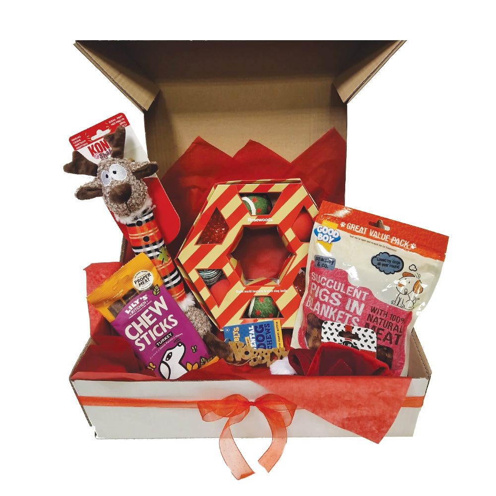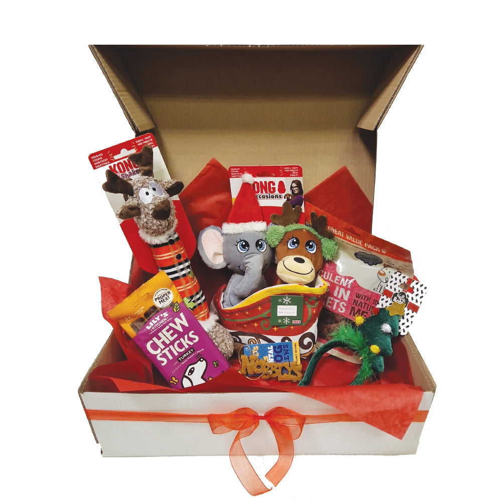 Typical hampers include one main festive toy and various treats and toys. The perfect gift for your pooch, or a great gift for a friends dogs. What are you waiting for?