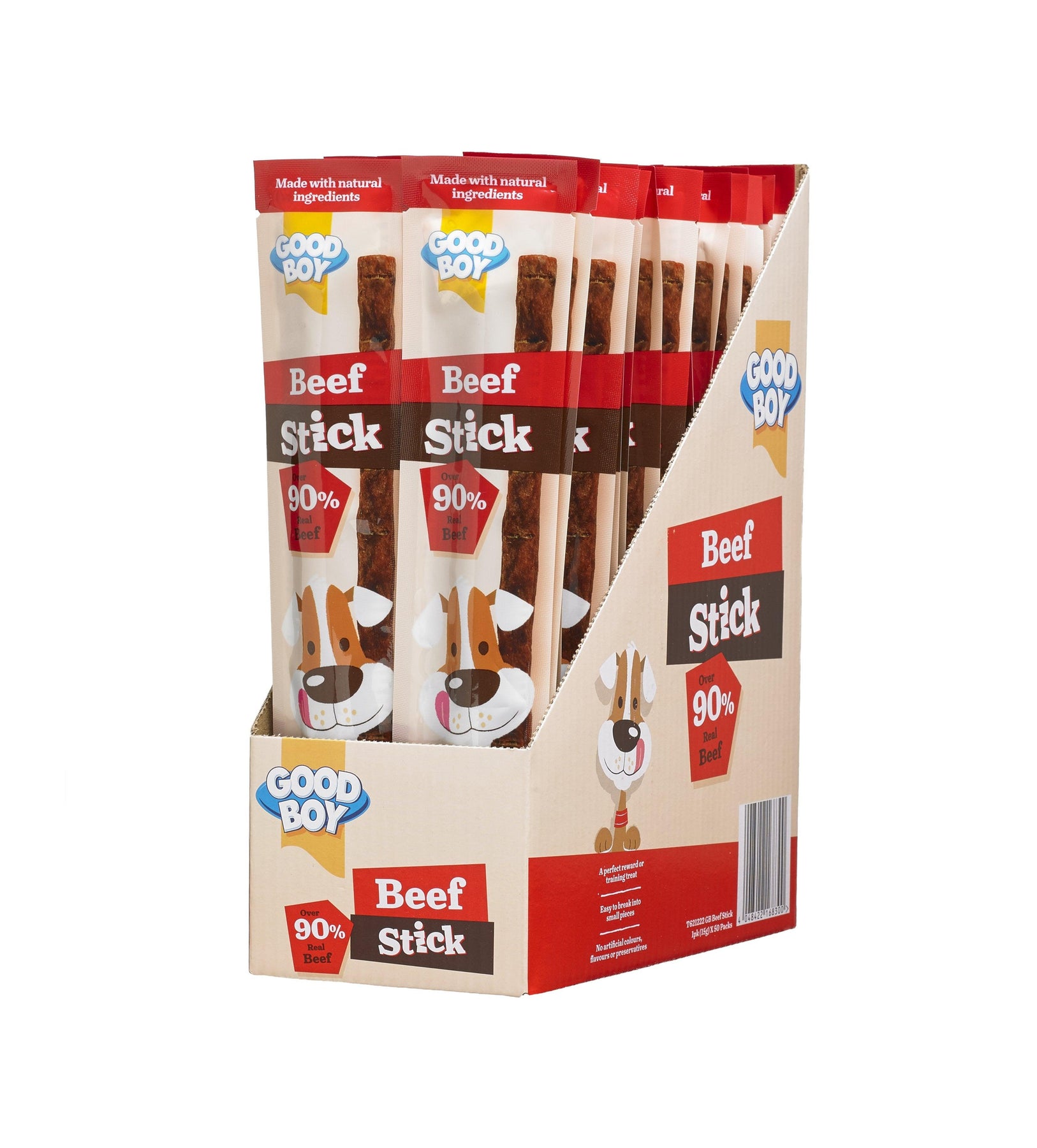 Good Boy Stick Beef Dog Treats. This super tasty Beef Stick is the perfect training treat or reward for dogs of all shapes and sizes. Gently oven baked for a soft chewy texture, this super tasty stick can be used to entice even the naughtiest of doggos to behave! Made with over 90% Beef Meat – no other meats added! Smaller portions, giving you the perfect bite size reward or training treats. Made with natural ingredients. No added sugar and no artificial colours, flavours or preservatives. Feed as a treat as part of a nutritionally balanced diet and our treats should not exceed 10% of your dog's daily calorie intake. Check that your dog has plenty of fresh water available, just in case they get thirsty. This treat should be given under supervision, on a non-stainable surface. Not suitable for puppies under 4 months old.