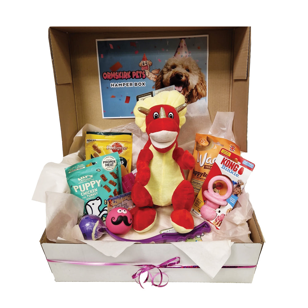Typical hampers include various treats and toys suitable for puppies. The perfect gift for your pooch, or a great gift for a friends puppy. What are you waiting for?