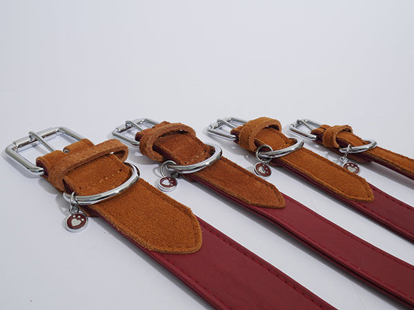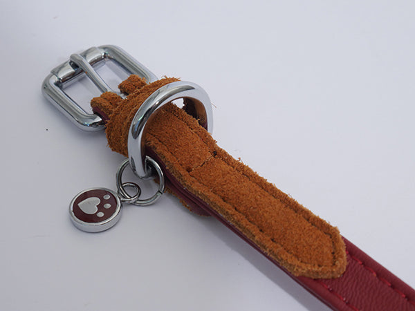 Quality luxury leather collar available in four sizes and leads in one width size. Crafted from fine leather and suedette material with robust fittings and embellished with neat details including hand stitching and decorative paw charms. Quality buckle fastening.