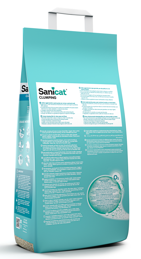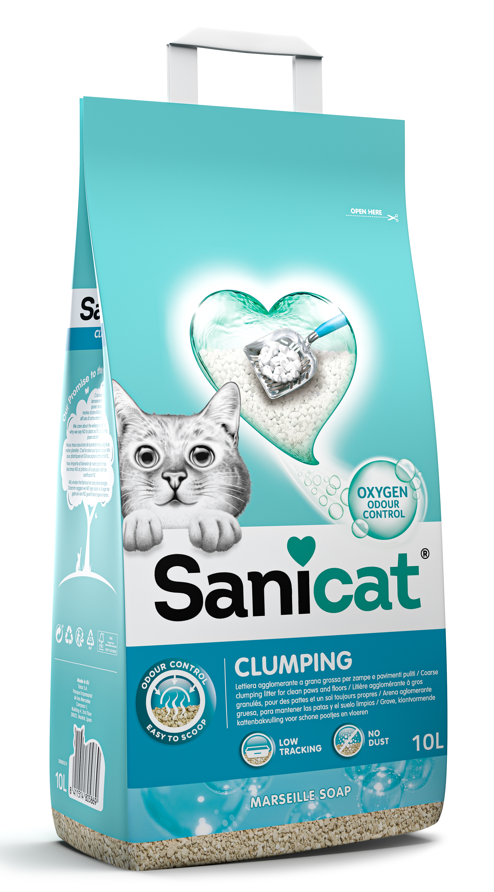 Sanicat Clumping is a natural clump forming clay cat litter with a Marsella Soap scent for everyday freshness. Enriched with oxygen to neutralise unpleasant odours. No dust and coarse granules reduce tracking and is soft on your cats paws. Packaging is high quality FSC certified paper and 100% recyclable.