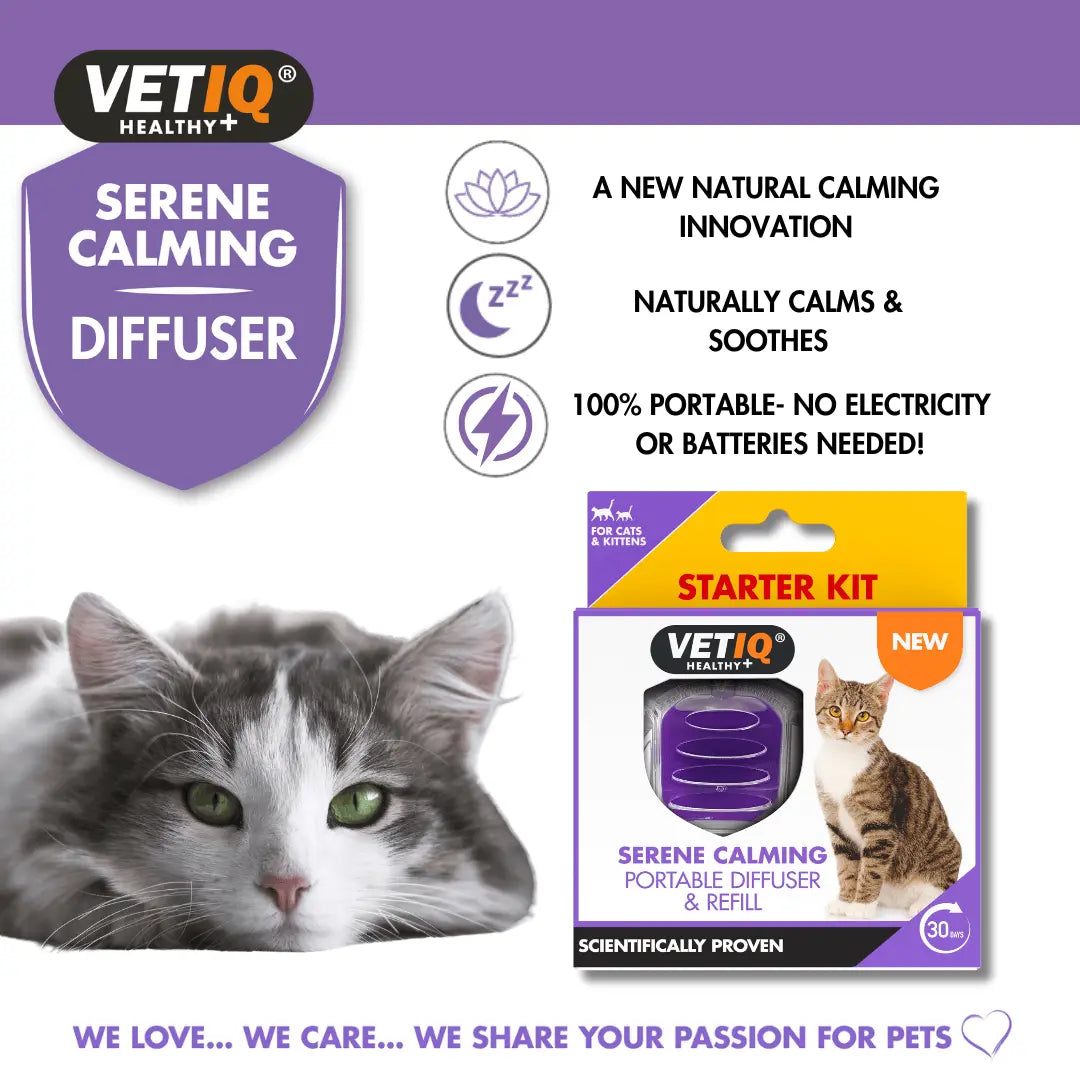 VETIQ® Serene Calming Portable Diffuser is a new calming innovation for cats & kittens to calm and relax your feline friends at home when they experience separation anxiety, anxiousness, hyperactivity, without the sedative effect. The portable plug free transparent holder fits discreetly in your home and the active calming insert is scientifically researched to calm and relax your feline pets when they experience stress. It works by releasing a pheromone into the air which helps your cats relax naturally. The diffuser covers 65m² & lasts for 30 days, after which a refill is needed. No plugs or electricity required.