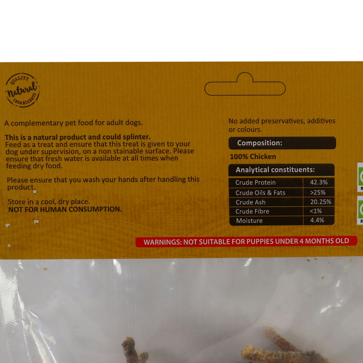 A crunchy treat that all dogs are sure to love, our natural chicken feet are made from 100% chicken for a healthy and delicious reward. High in protein and low in fat, these chicken feet dog treats contain no added preservatives or colours, and will help to promote a shiny coat and healthy skin. As it is a natural product, there is some possibility that these treats can splinter. Although they are suitable for adult dogs of all breeds and sizes, we do recommend that you supervise your dog at all times and ensure fresh water is available.