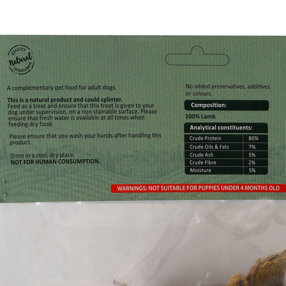 Made from 100% lamb which contains no added preservatives or colours, our natural dog treats are high in protein and low in fat, making a delicious and healthy complement to your dog’s diet.