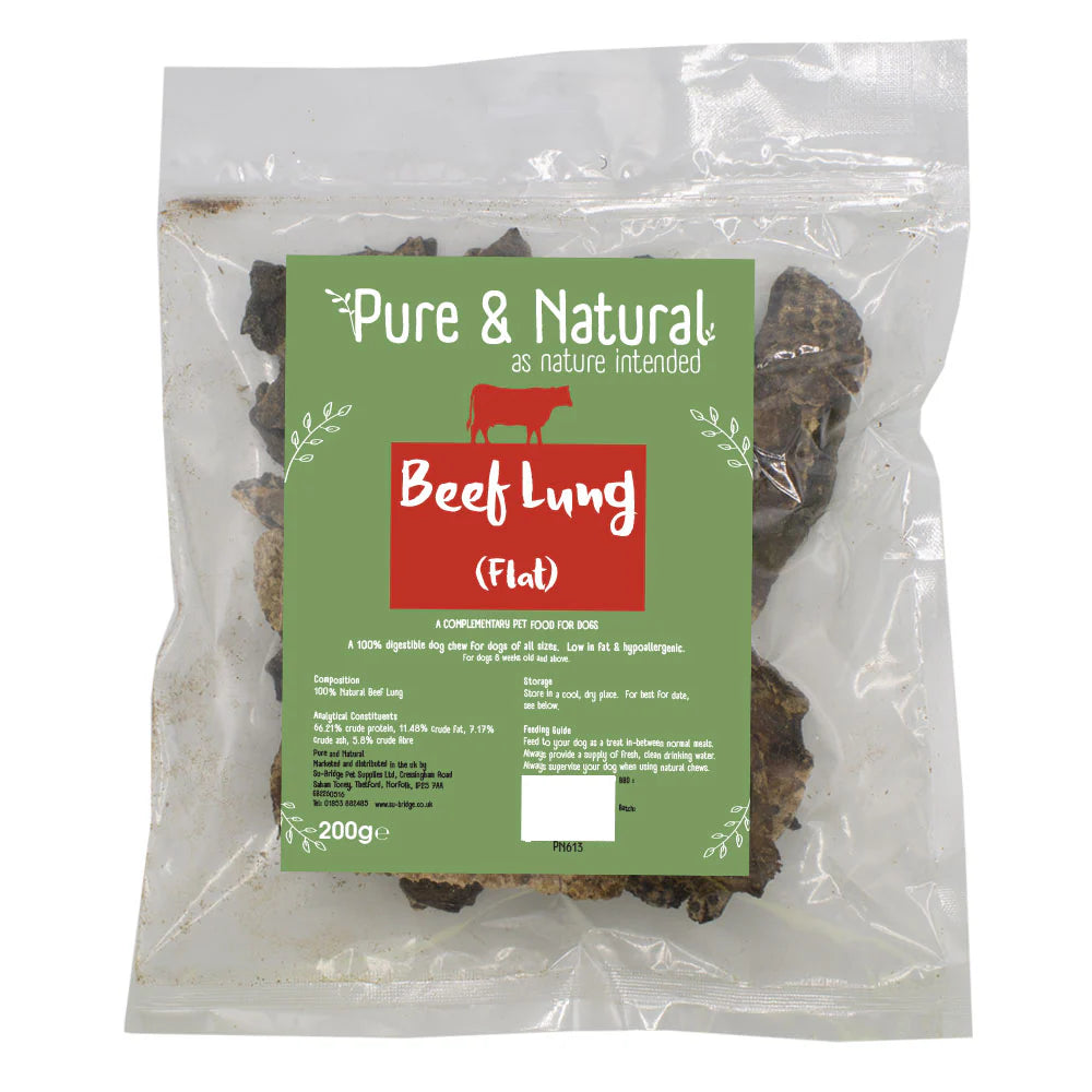 Pure & Natural Beef Lung Flat is a healthy and nutritious treat for dogs. Made from 100% pure beef lung, this treat is high in protein and low in fat, making it a perfect snack for dogs of all sizes and breeds. This all-natural treat is free of artificial preservatives, colours, and flavours, ensuring that your furry friend gets the best quality snack possible. With its delicious flavour and soft, chewy texture, Pure & Natural Beef Lung is sure to become your dog's new favourite treat. Give your furry friend the gift of pure and natural nutrition with Pure & Natural Beef Lung Flat.