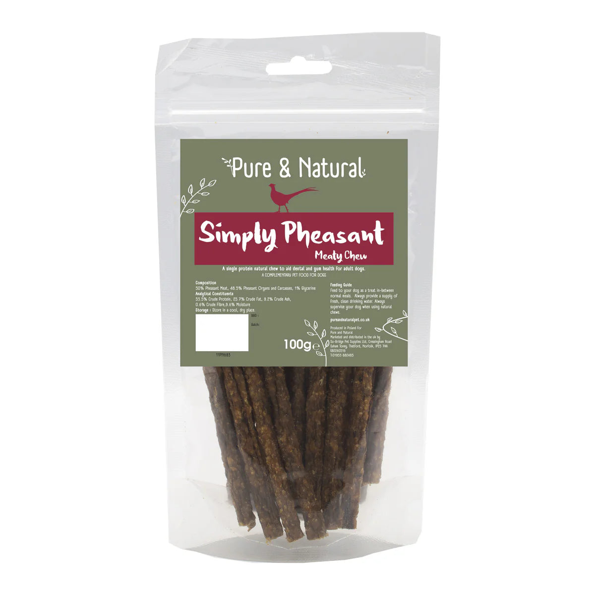 Pure & Natural Simply Pheasant dog chews are a healthy and delicious treat for your furry friend. Made with 100% pheasant, these meat stick dog chews are all-natural and free from artificial additives, preservatives, and fillers. They are a great source of protein and essential nutrients, making them a nutritious snack for dogs of all sizes and breeds.