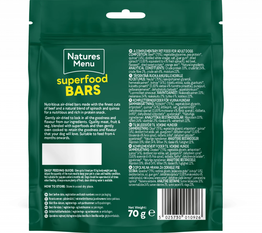 A highly nutritious, protein-rich snack bar made with delicious beef, spinach and quinoa that your fur-ever friend will love you for! Made with natural ingredients. Pack size 70g.