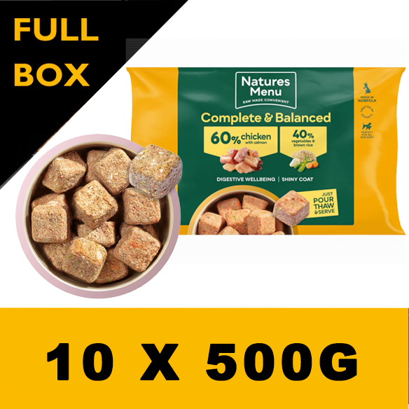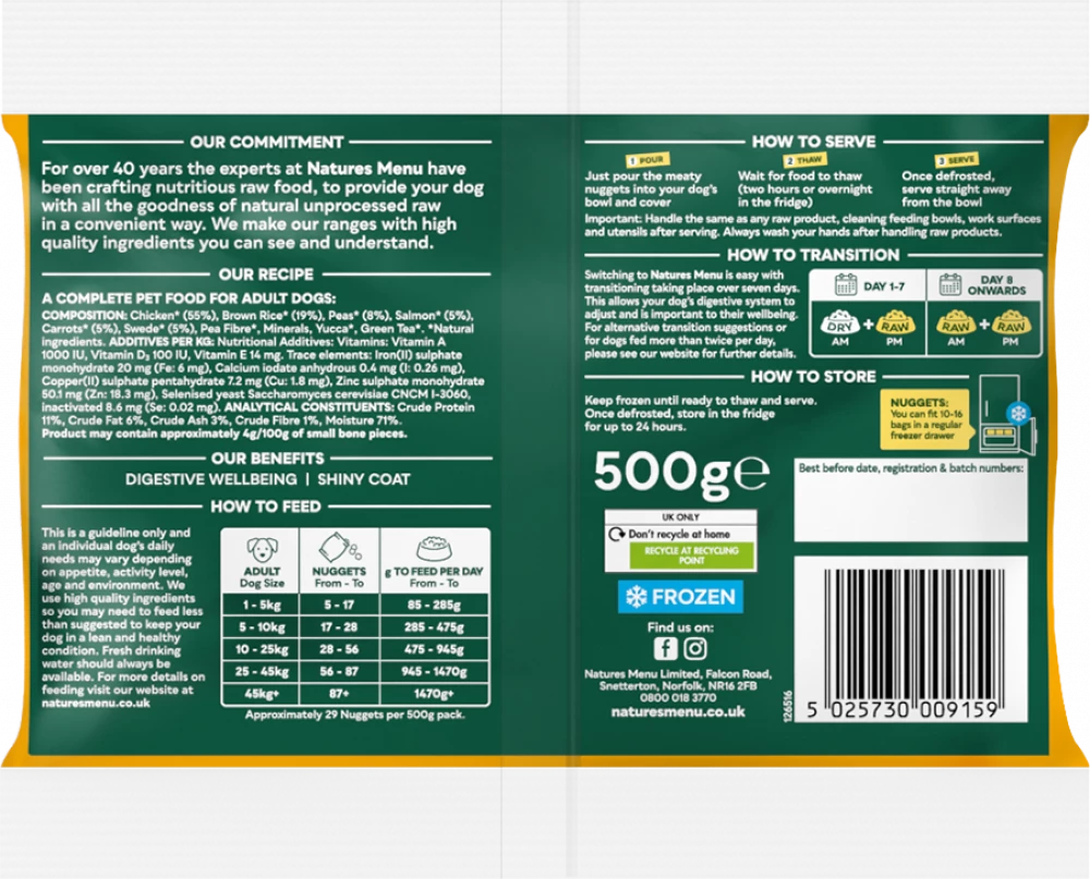 Our frozen chicken nuggets for dogs are a delicious blend of lean chicken, tasty, nutritious vegetables and wholesome brown rice. Our raw chicken nugget dog food is an obvious choice for many owners, and as chicken is packed with vitamins, minerals, essential amino acids as well as being easy on digestion and a tasty source of protein, it’s easy to understand why.