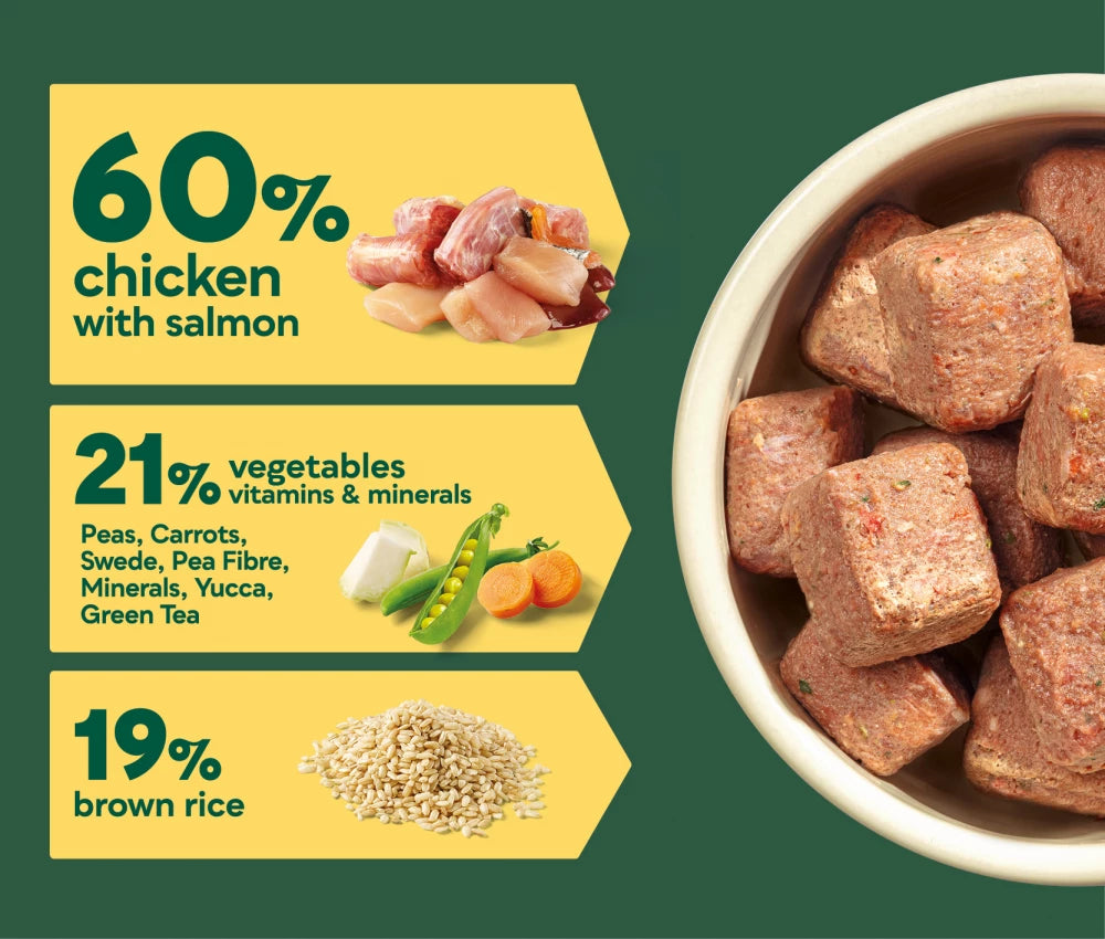Our raw, freshly frozen chicken nuggets for dogs are simple to serve, and with parboiled brown rice mixed in, provide your dog with an easy to digest, non-starchy carbohydrate, rich in minerals and vitamin B. They provide your dog with everything they need and nothing they don’t, as we only ever use quality, responsibly sourced, human grade meat in our recipes, all of which are made to FEDIAF guidelines and approved by our trusted experts.