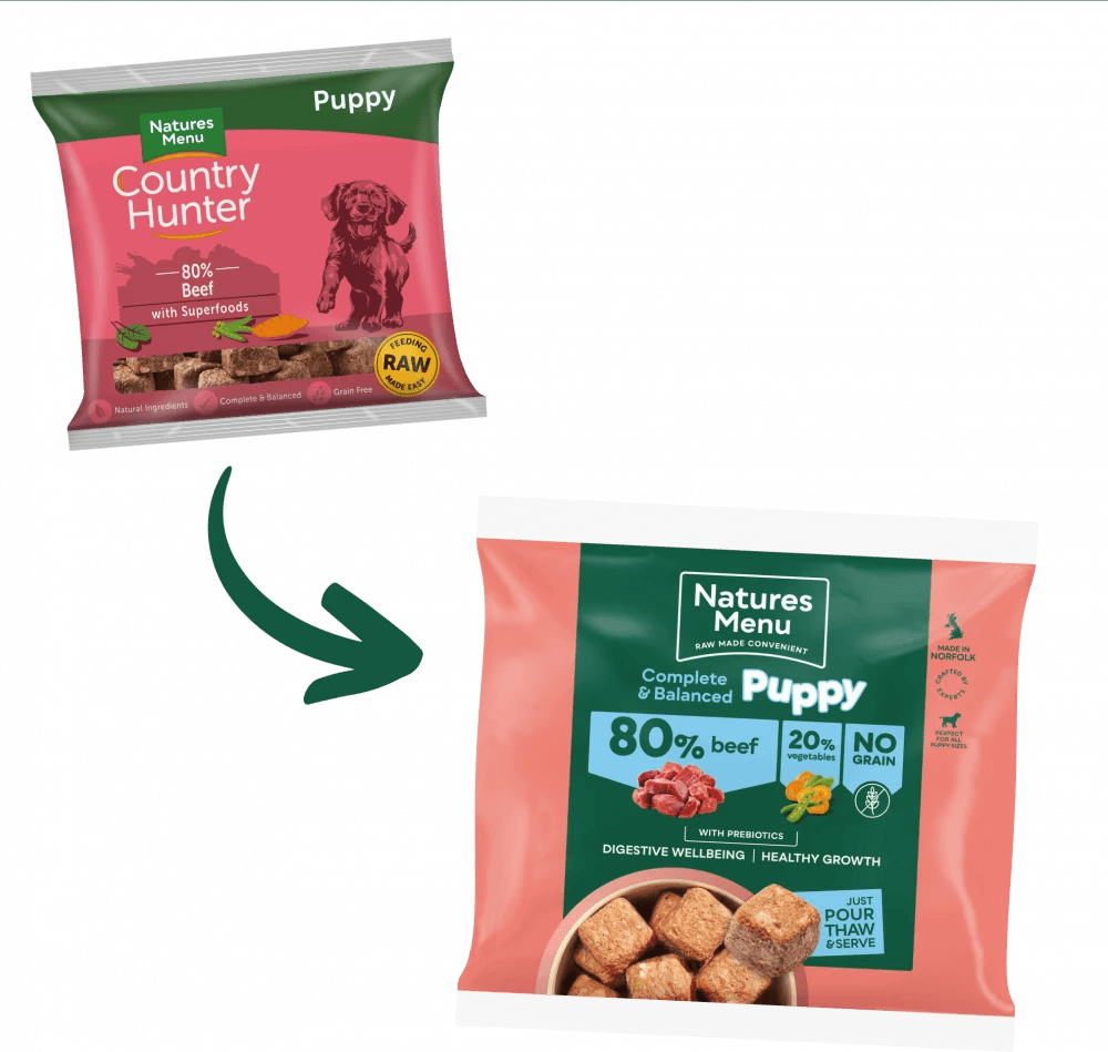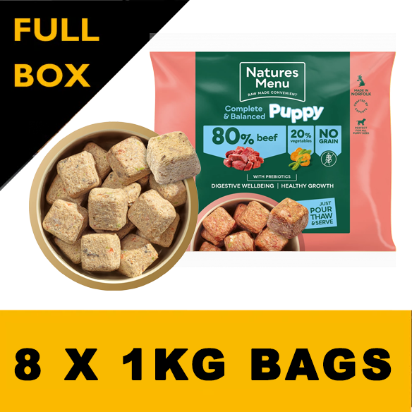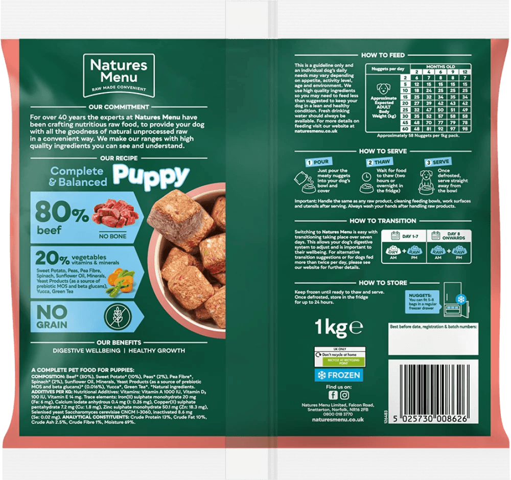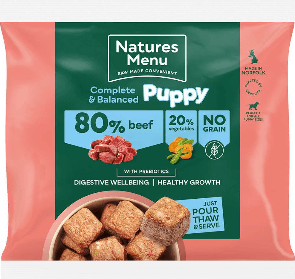 Our Natures Menu Complete & Balanced 80/20 beef puppy food is suitable from weaning and packed with high quality ingredients to give your growing pup everything they need to support digestive wellbeing and healthy growth.