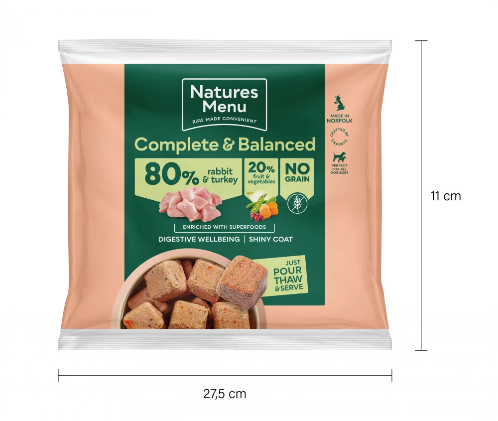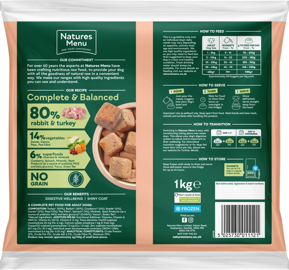 For over 40 years our in-house team of experts have been crafting naturally nutritious raw food that’s convenient to serve. Freshly frozen, our rabbit and turkey dog food nuggets are perfect for mess-free meal times. When serving, simply pour the number of nuggets you need into your dog’s bowl, wait for it to thaw, then serve and watch your dog eat with gusto!