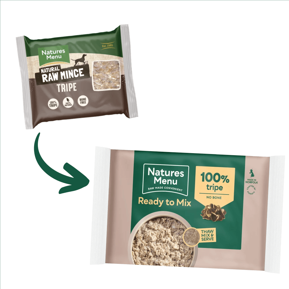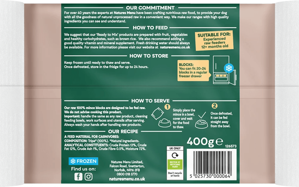 Just Tripe Raw Mince is an ingredient or treat, not a complete meal. Add it to other ingredients to make balanced and nutritious raw meals at home.