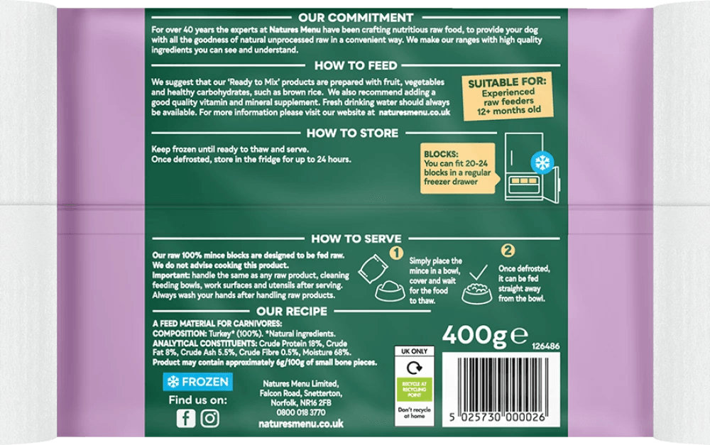 Just Turkey Raw Mince is an ingredient or treat, not a complete meal. Add it to other ingredients to make balanced and nutritious raw meals at home.