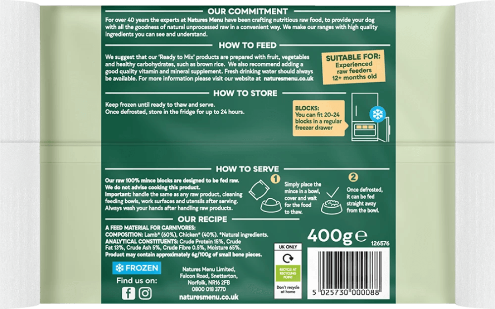 Just Lamb and Chicken Raw Mince is an ingredient or treat, not a complete meal. Add it to other ingredients to make balanced and nutritious raw meals at home.