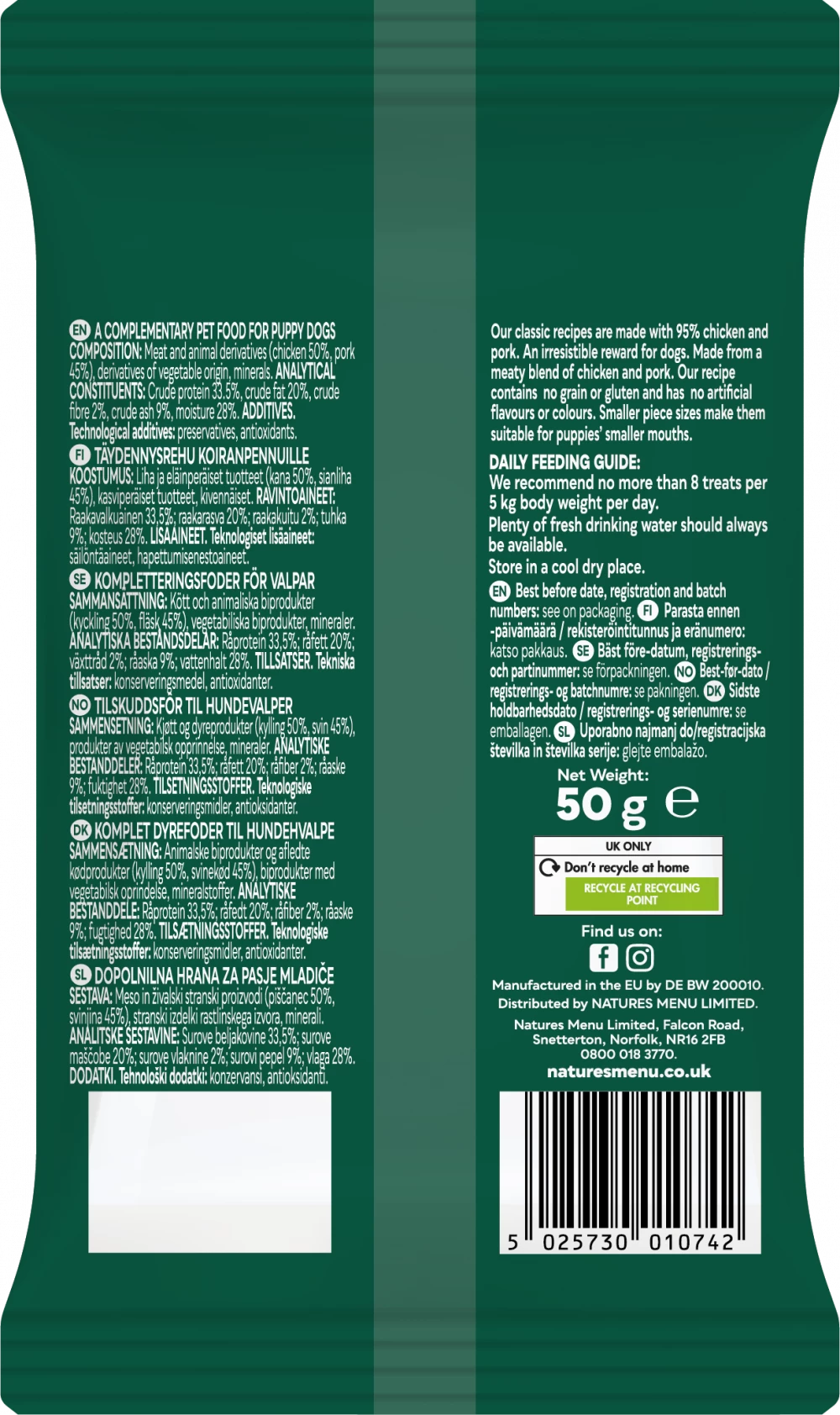 These mouth-watering meaty treats are made with 95% chicken and pork, because your puppy deserves the best. Pawfect training rewards. No gluten. Pack size 50g.