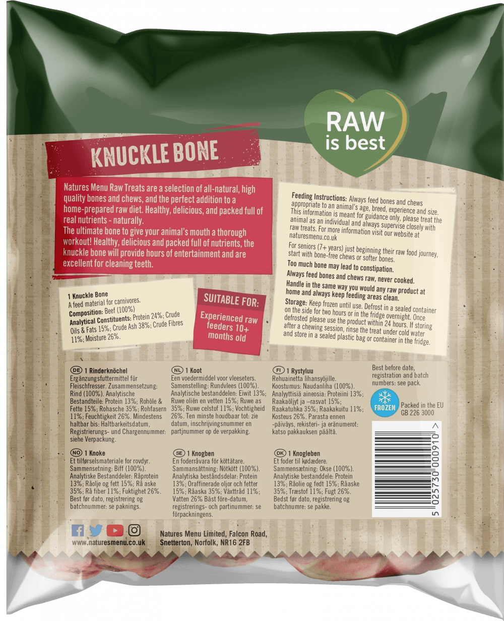 The ultimate bone to give your dog's mouth a thorough workout! This beef Knuckle Bone will provide recreational entertainment and is extremely tough and mighty for those who like a big chew. Suitable for experienced raw feeders 10+ months old. Pack size 1 x Beef Knuckle Bone.